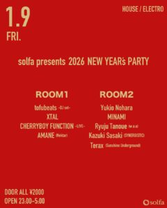 新年を迎えての初週末にはtofubeats、XTAL、CHERRYBOY FUNCTIONの00’s〜10’s ハウスミュージック/メロディアスなダンスミュージックを想起させる共演と4人目のピースには東京次世代ハウスDJとして充分に実力をつけてきたAMANEがラインナップ。