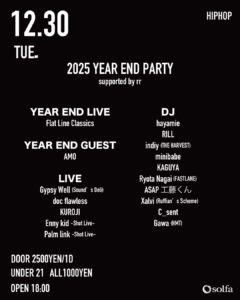 年内最後のsolfaのアクトをFlat Line Classicsが務める。 そして年内最後のゲストアクトとしてAMOを迎えたsolfa presents 2025 YEAR END PARTYが開催。