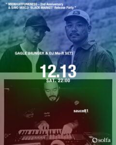 今年最後の本パーティーのヘッドライナーには、東北・仙台のレジェンダリーGAGLEよりHUNGER & DJ Mu-Rのセット、UKのEglo Recordsをはじめとした国内外のレーベルからコンスタントにリリースし続け、歌やシンセのループをリアルタイムで組み上げて行くファンキーでソウルフルなライブを行なうsauce81を迎える。