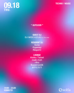 毎月第二木曜日にGoto、Ogaway、Nobuharu Morimoto、Negamiの4名が主催するテクノパーティー“OUTSIDER”