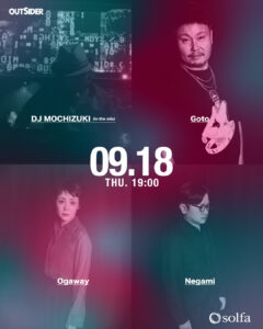毎月第二木曜日にGoto、Ogaway、Nobuharu Morimoto、Negamiの4名が主催するテクノパーティー“OUTSIDER”