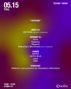 Goto、Ogaway、Nobuharu Morimoto、Negamiの4名が主催するテクノパーティー“OUTSIDER” 骨太で穏やかな、音と人の空間。 グルーヴ感たっぷりのダンスミュージックとコミュニケーションが堪能できる。